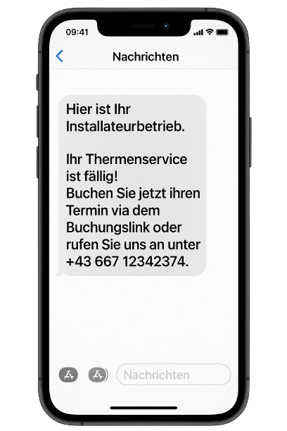 30 Tage vor dem Wartungstermin erhält Ihr Kunde automatisch eine SMS – DSGVO-konform, mit Ihrem Namen und Telefonnummer.2. Termin buchen